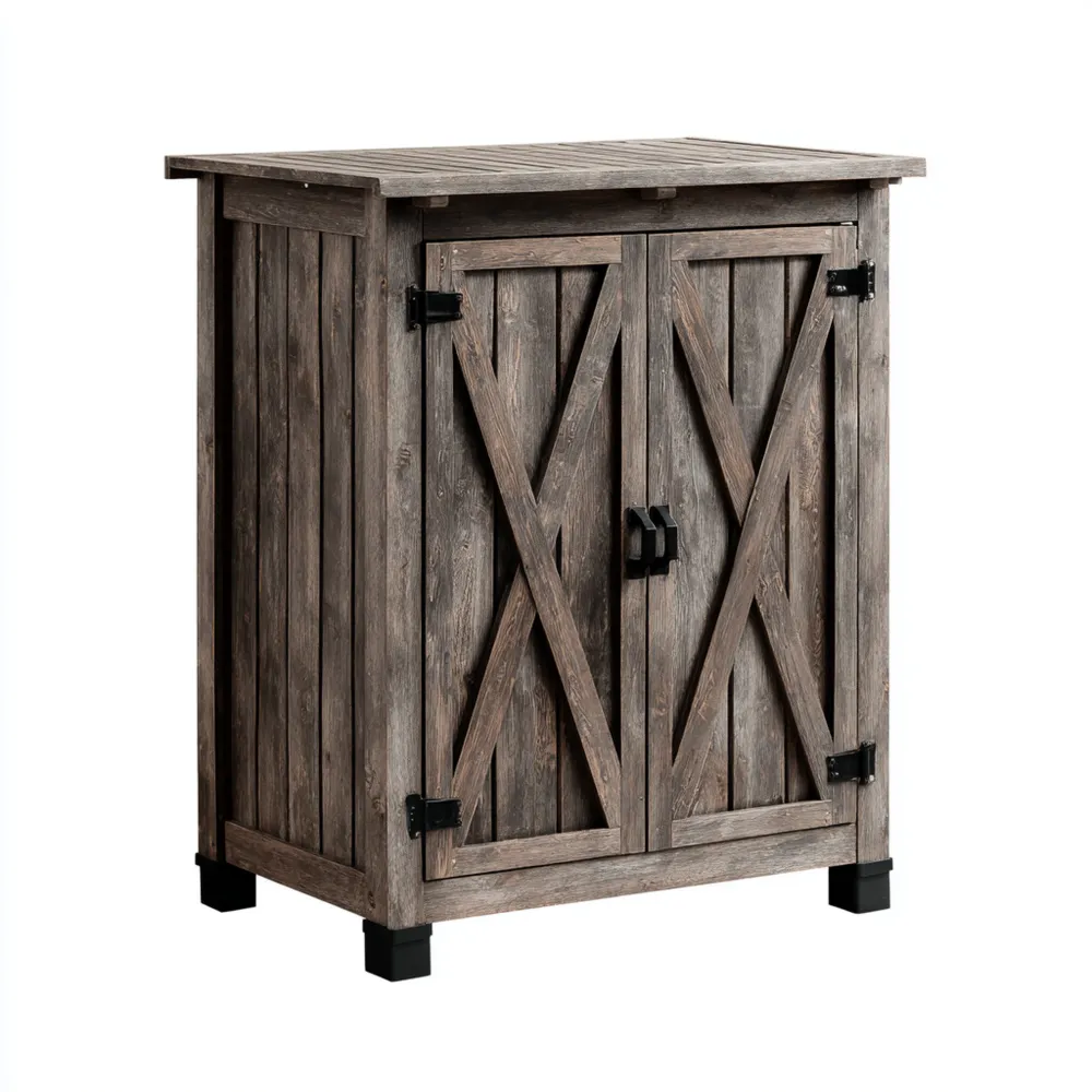 Dieser robuste Geräteschuppen aus Holz bietet eine ideale Aufbewahrungslösung für Ihren Garten. Im rustikalen Stil gehalten, fügt er sich harmonisch in jede Umgebung ein.